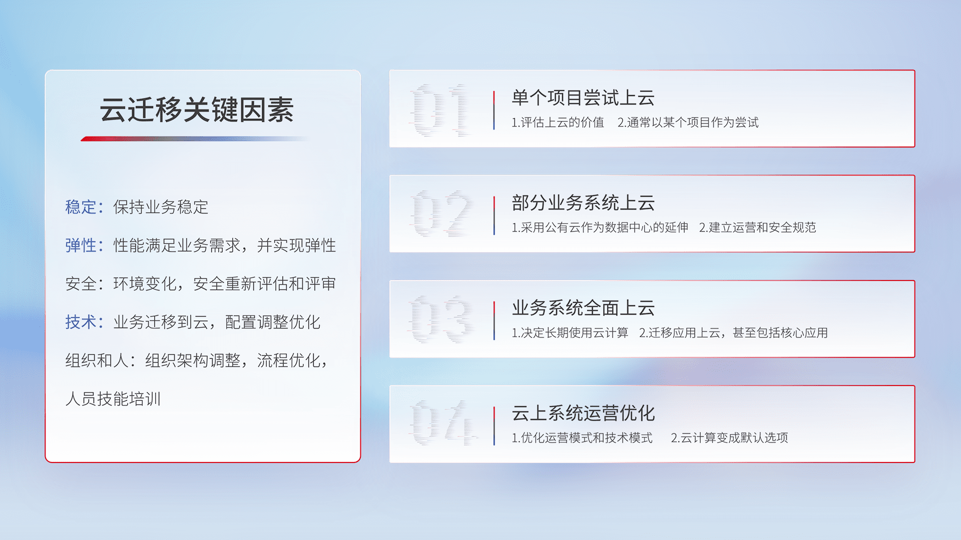 结合实际业务,,,,从规划设计、、、、云平台选型、、、云原生改造、、、、数据迁移、、、集成交付,,,,迁移全过程为客户识别最佳上云路径,,做好风险识别管理,,,,设计网络架构、、、身份权限、、、、安全审计合规、、、、操作审计、、、、日志审计、、监控告警策略、、、、多站点容灾设计等,,,,对云上基础设施进行整体规划,,,,提升IT治理水平,,,,以满足弹性、、高可用、、、高性能的需求。。